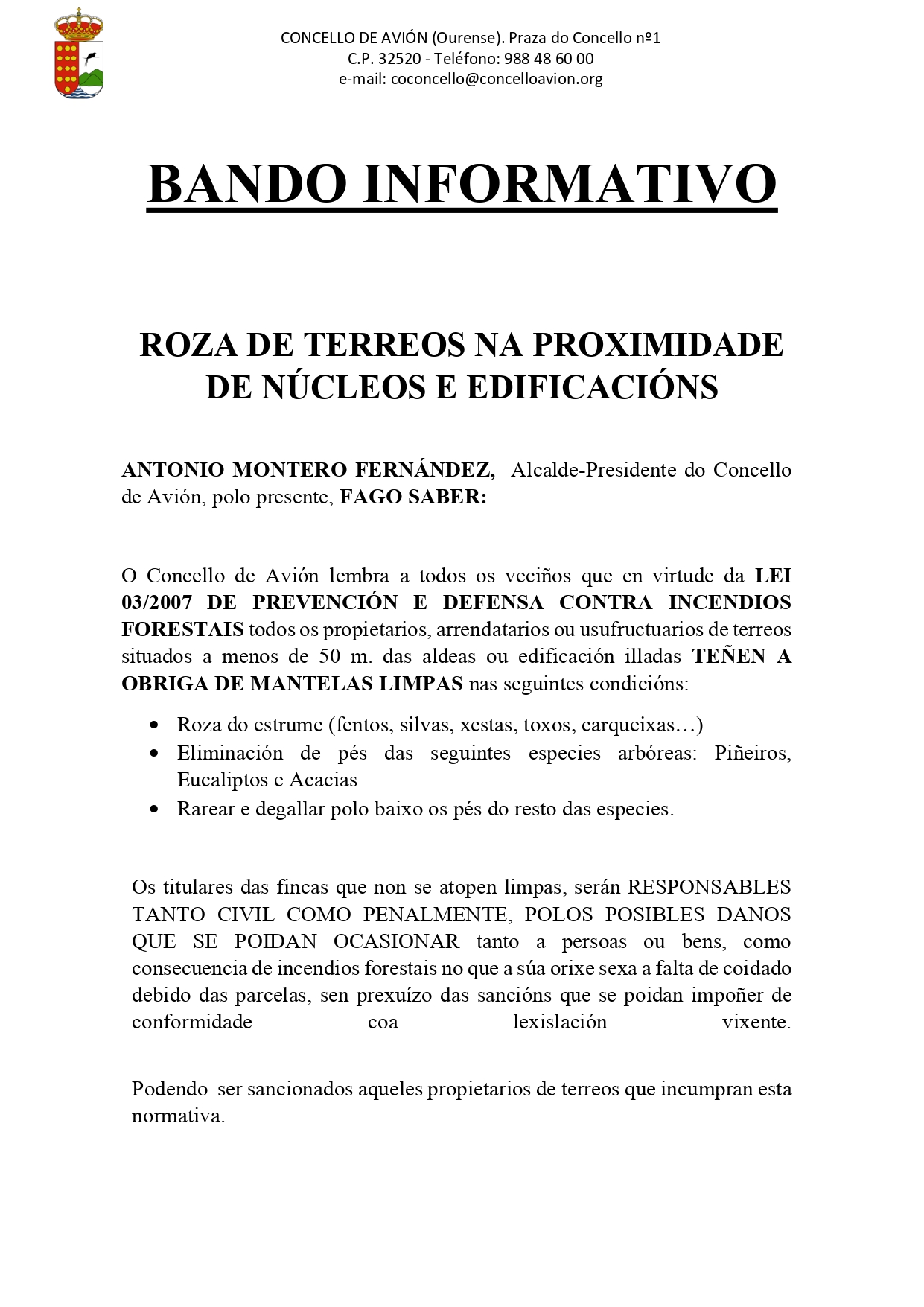 Bando informativo sobre la obligatoriedad de mantener limpias las fincas en el perímetro de 50 metros alrededor de los núcleos. También hay que mantener limpias las fincas colindantes con viviendas y las casas en ruinas.