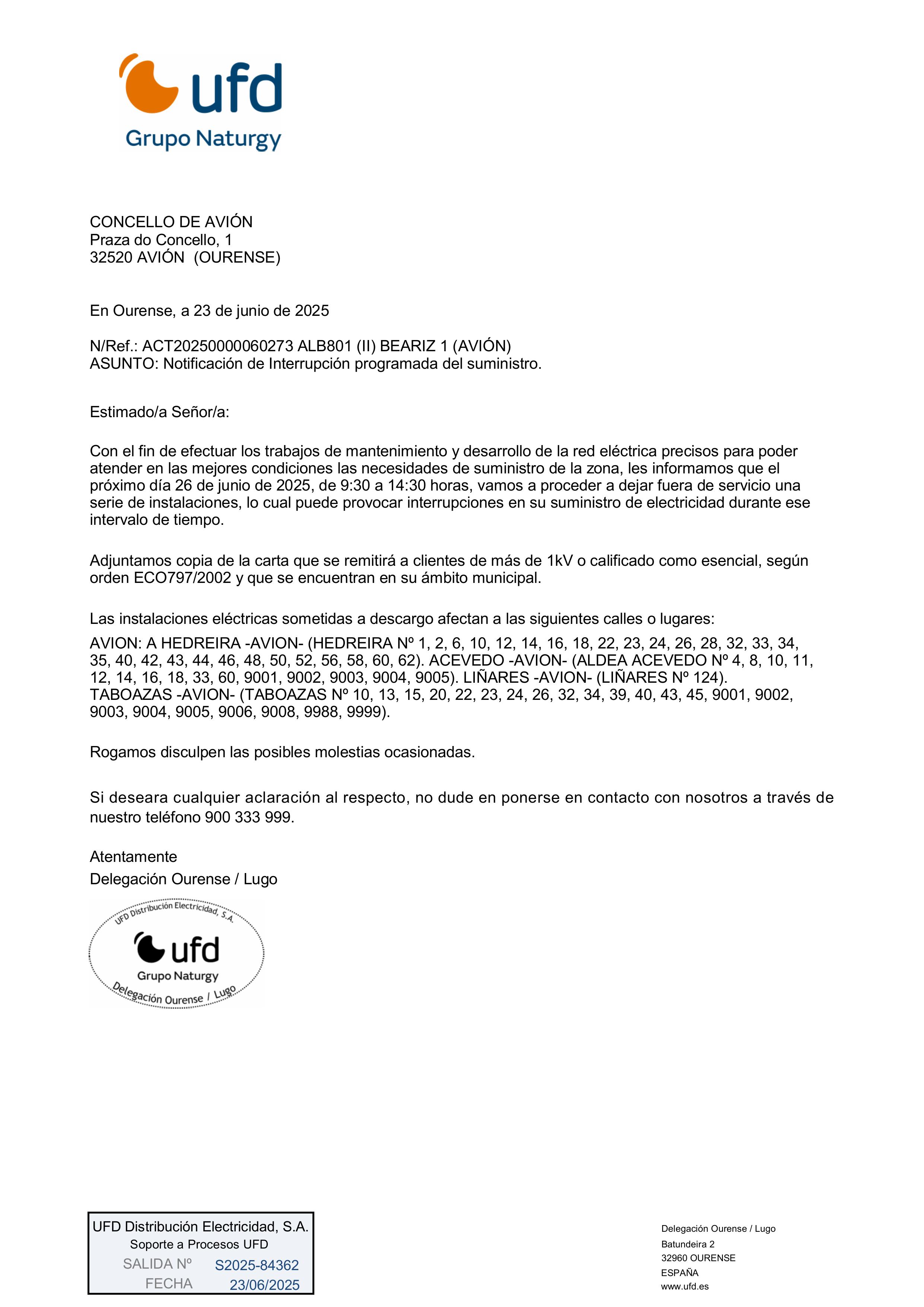 Desde UFD Distribución Eléctrica comunican que el próximo jueves 26 de junio de 2025, se realizará una interrupción del suministro eléctrico por trabajos de mantenimiento y mejora de la red.
