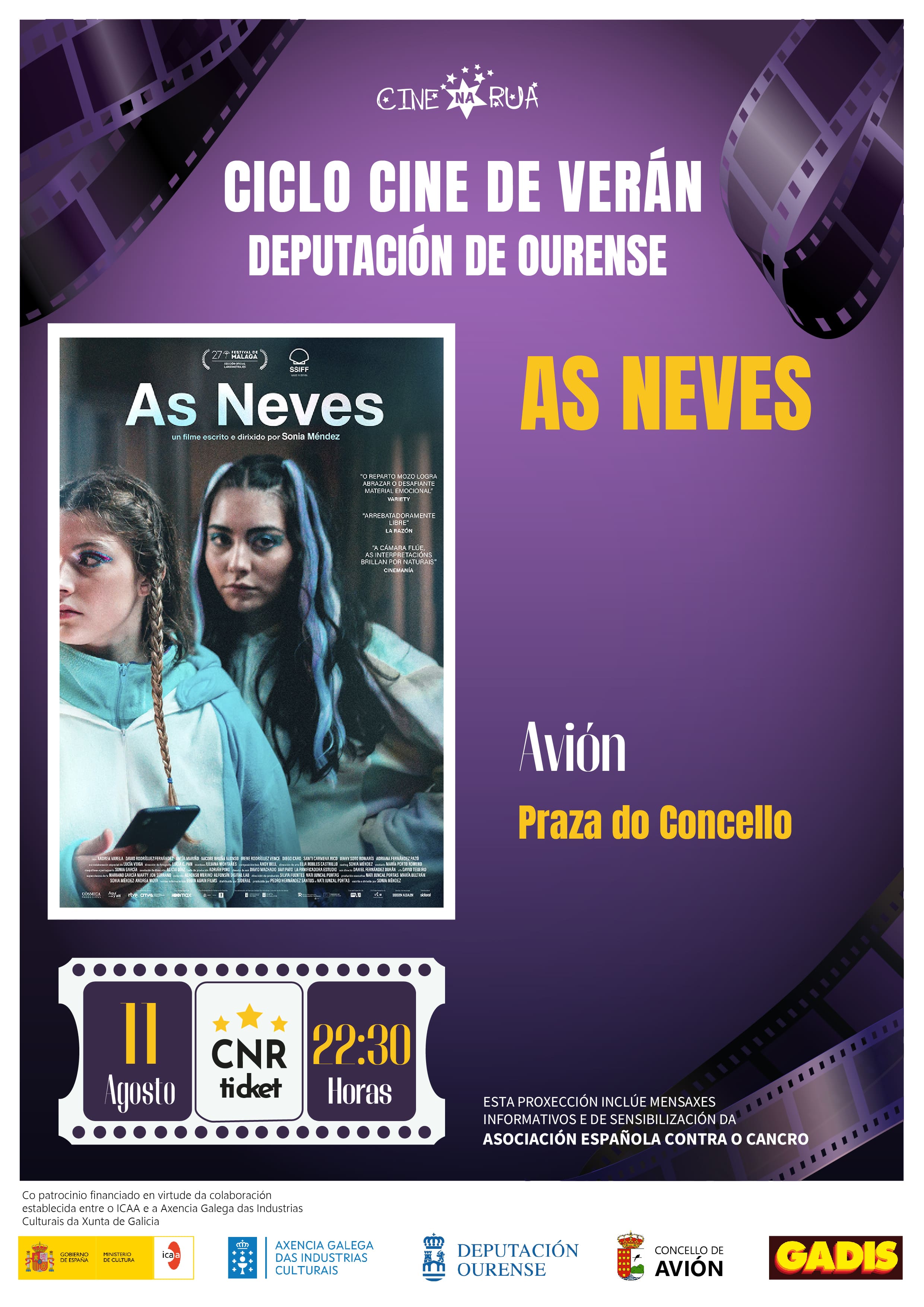 El próximo lunes 11 de agosto a las 22:30 h, no pierdas la proyección de la película “AS NEVES” en la plaza del Concello.