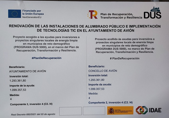 Desde el Ayuntamiento de Avión comunicamos a la ciudadanía la información de las ayudas obtenidas del programa DUS 5000 y el apoyo de la Unión Europea – NextGenerationEU que pretenden facilitar la puesta en marcha de proyectos sostenibles de eficiencia energética, de generación de energías renovables –en particular lucha contra la contaminación lumínica, alumbrado eficiente en inteligente, Smart Rural y TIC–, y de impulso a la movilidad eléctrica.