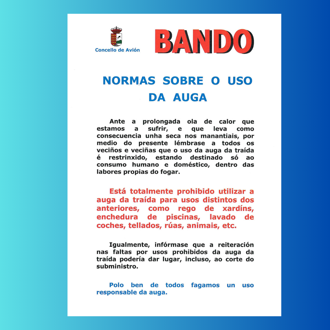 Por outra parte, queda totalmente prohibido destinar agua de la traída para regar jardines, llenar piscinas, lavado de coches, tejados, calles, animales, etc.