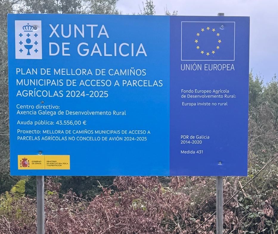 A Axencia Galega de Desenvolvemento Rural concedeu ó Concello de Avión unha axuda por un importe de 43.556 €, dentro do plan de mellora de Camiños municipais de acceso a parcelas agrícolas 2024-2025 (MR701E), o proxecto desenvolverase no camiño de Cendóns en Avión e dita axuda conta con financiamento da Unión Europea.