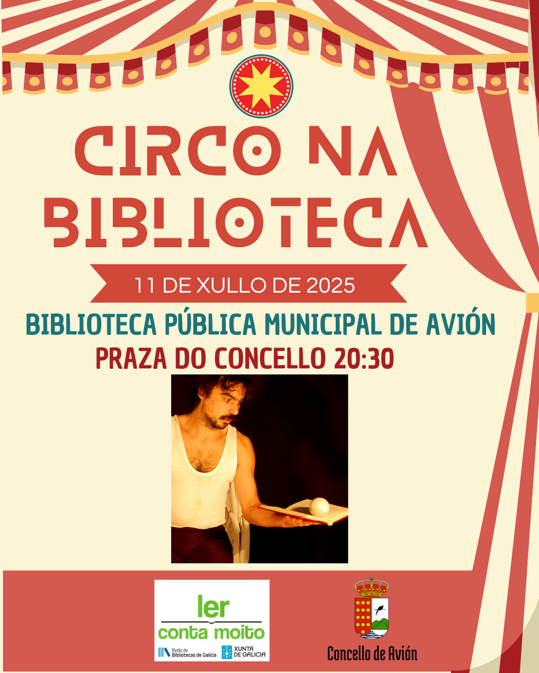 O vindeiro venres 11 de xullo terá lugar a actuación "Circo na Biblioteca" de Dani Blanco con números imposibles, pelotas, equilibrios, clown, música e moito máis.